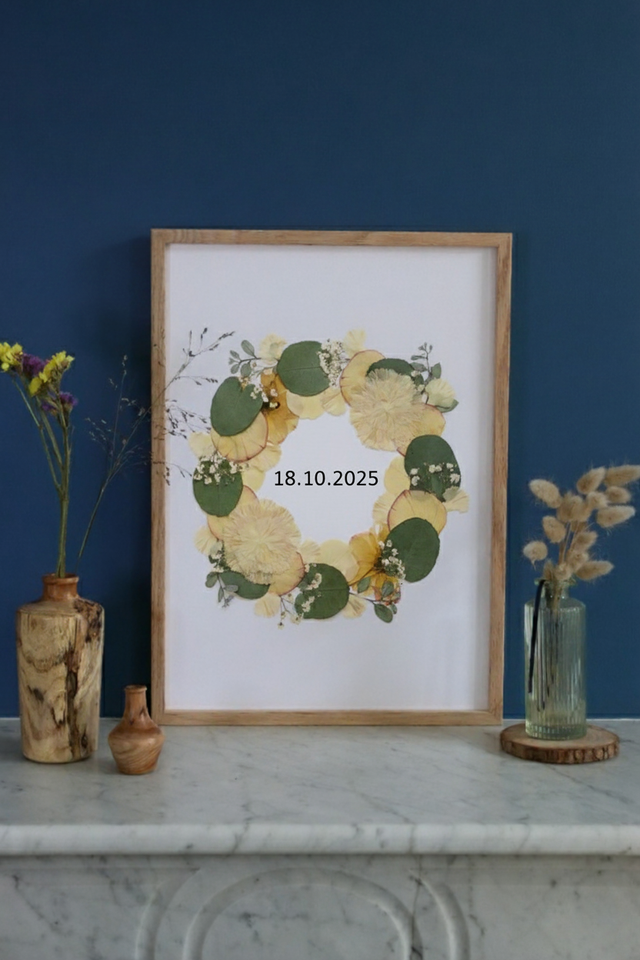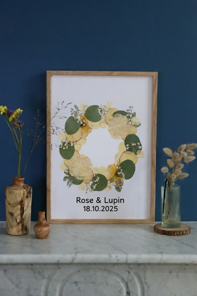 🌸 Composition : fleurs pressées issues de votre bouquet ou de votre composition florale (mariage, cérémonie, événement), cadre en bois massif, papier 250g/m² certifié PEFC, vernis colle à base d'eau.
