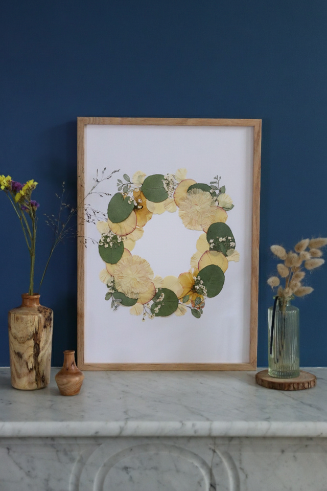 Chaque création est composée de vos fleurs pressées, soigneusement disposées sur un papier blanc 250 g/m² certifié PEFC (sans acide, respectueux de l’environnement), puis encadrées dans un cadre en chêne ou en hêtre massif et protégées par un plexiglas transparent.
