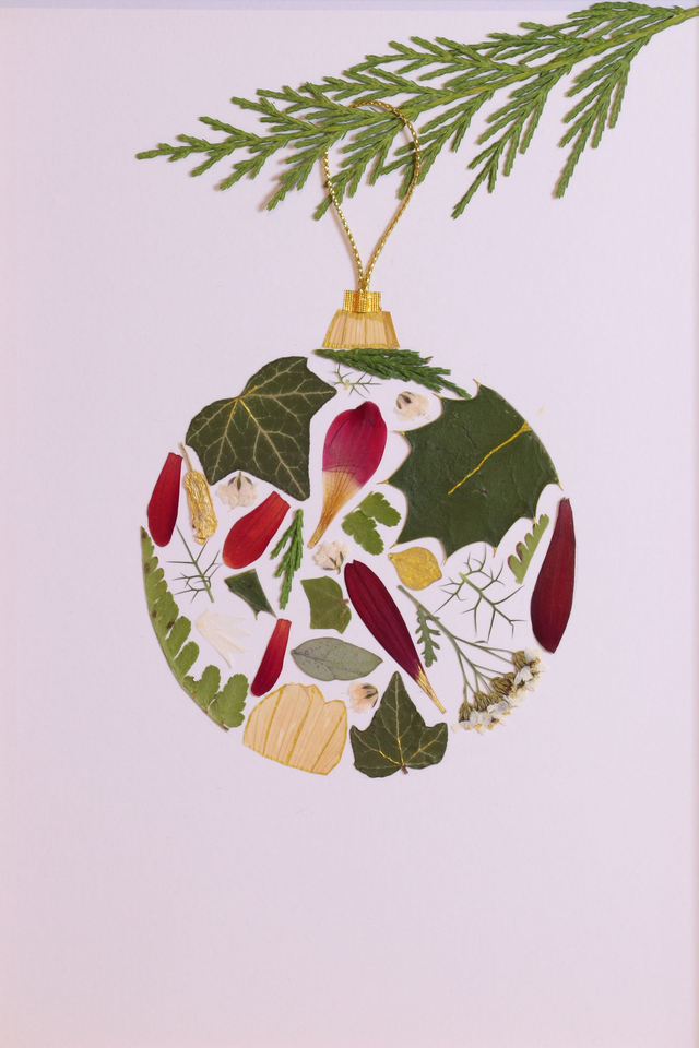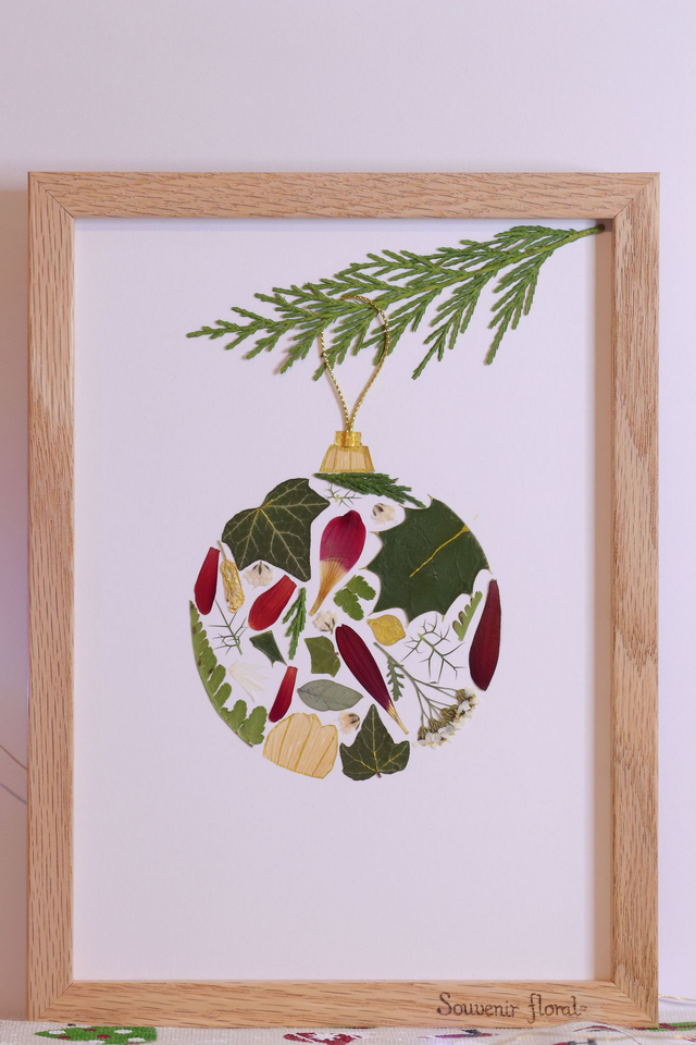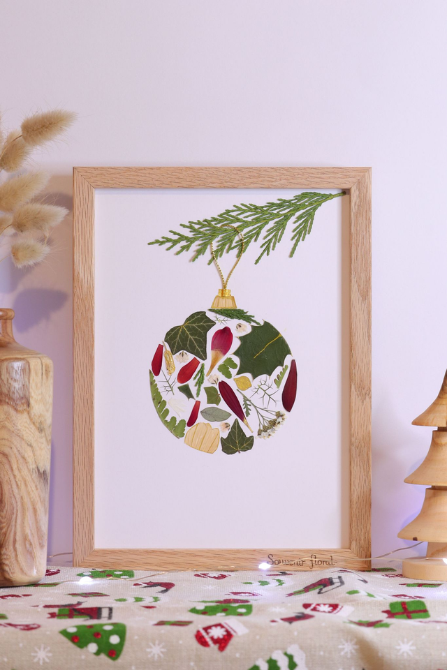 Cet herbier spécial Noël capture la magie des fêtes dans une création délicate et chaleureuse. Imaginé sous la forme d’une boule de Noël suspendue à une branche de sapin, il mêle poésie hivernale et élégance naturelle. Entièrement réalisé à la main, chaque détail évoque la douceur des décorations traditionnelles et la beauté des fleurs de saison pressées avec soin.