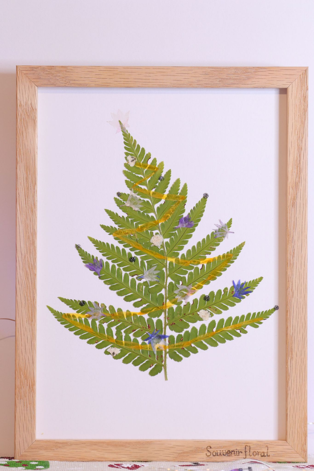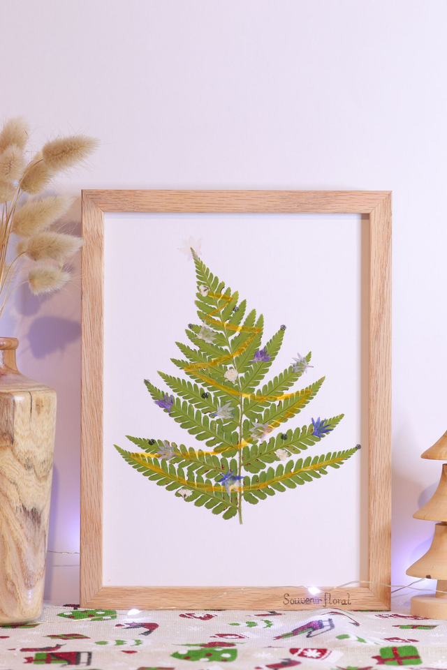 🌸 Composition : fleurs pressées issues de mon jardin (fougère, pétales de soucis, centaurée et gypsophile). Cadre en chêne massif, papier 250g/m² certifié PEFC, vernis colle à base d'eau.
